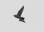 Juvenile peregrine flew over carrying prey, getting harrased off at least 10 corvids