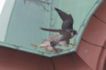 2 peregrines close to the traditional site, quite vocal, one bird feeding then had a small portion removed by the other. A near full size pigeon was later moved to a site which has not been traditionally used for plucking.