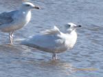 The Glaucous Gull appears to be the 'course' individual as seen by Ian and others. The Iceland Gull was bunkered down on the sand with its head tucked in but, on my second walk up to the eastern end, it was up and moving about, turning out to be the dark billed one.