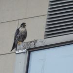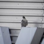 The peregrine was perched atop Beyond, best seen from the Trafford Way near the cycle shop. By the way it was mantling it had obviously caught something, by the size it was more likely a thrush or blackbird rather than a pigeon.