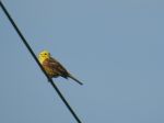 Farmland West of Alder Lane & Sankey Brook : 1 Corn Bunting alongside a flock of 28 Linnets on wires by Phipps Brook, with