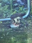 - large female Sparrowhawk caught a Pigeon / Woodpigeon and ate it under the trampoline in Mums nextdoor neighbours garden