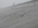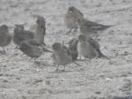from 2.30pm, I bumped into a chap that said a flock of twite were feeding on the beach & there was only about 50 of them. when I went to look a very large flock of small birds were flying around & I estimated at least 200 birds in the flock. when they landed on the concrete slope & beach a look & count of at least 200 twite & at least 30 linnets were feeding. some shots attached in the murky conditions.