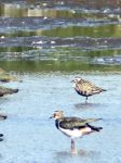 The bird showed well, first on Pump Pool  and then it took off and flew and landed on the Main Pool near Garganey Scrape. Unusually the bird was not with a single Eurasian Golden Plover but mainly satyed with the Lapwings and a single Ruff. One time though the Lapwings flew and the American Golden Plover was the only bird remaining! Now amongst Canada Geese! I got a few record digiscoped pics, including a raised wing shot, showing the diagnostic grey underwing, which was very noticeable in flight too. After I had left the bird was joined by a 2nd adult American Goldie, amazing!! But then both flew off and hadn't returned by 4.08pm at least. Since it flew off yesterday but returned today there is a chance both will be back tomorrow. Well worth the visit for cracking plumaged birds.