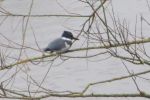 Belted Kingfisher showed well for a short period mid p. m, all be it distant from top of a dead tree looking up river, dropping down quickly when a Buzzard passed by.