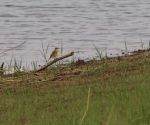 We drove on parallel to the grassy shoreline noting a large-billed Crow and a Black-winged Kite perched in a roadside tree. Scanning the lakeside we admired a rather smart Chinese Pond Heron in full summer attire and distant Little and Great White Egrets then I saw some encouragement in the shape of a Greenshank. We stopped to check out Barbs Little Ringed Plover while I checked out the Barn Swallows - about 20 lined up along the telegraph wires- the 4th from the right was in fact a Sand Martin and a Yasothon tick for me. Paul then found his bird of the day - perched on a stick was his long overdue first record for the province- an Eastern Yellow Wagtail which we quickly scoped up and which Paul was eager to photograph. This turned out to be of the form macronyx that very closely resembles thunbergi (Grey-headed Wagtail).