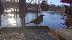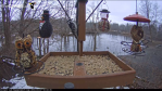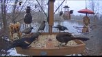 Ithaca NY Morning Dove, Red Bellied Woodpecker, Hairy Woodpecker, Red Winged Blackbird, Northern Cardinal, European Starling, some sort of Hawk in the trees at the back, 3 Blue Jay, Black Capped Chickadee, Grackles, Tufted Titmouse, all in 30 minutes