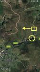 The circle is the lay-by on the A6024 where we viewed the bird from. The rectangle is the rough area the bird was flying. The arrow is the flight direction, West. The red line is the GM boundary.